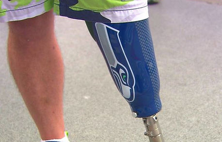 Pete Nichols lost a leg in a motorcycle accident. After the Seahawks won Super Bowl 48, he got permission from to use the team's helmet design as a tattoo for his prosthetic. Then, to get it made, he went to a one of a kind port orchard company called Prosthetic Ink. Airbrush artist Wm. Mark Dalton, who usually works on hot rods and Harleys, did the paint job.